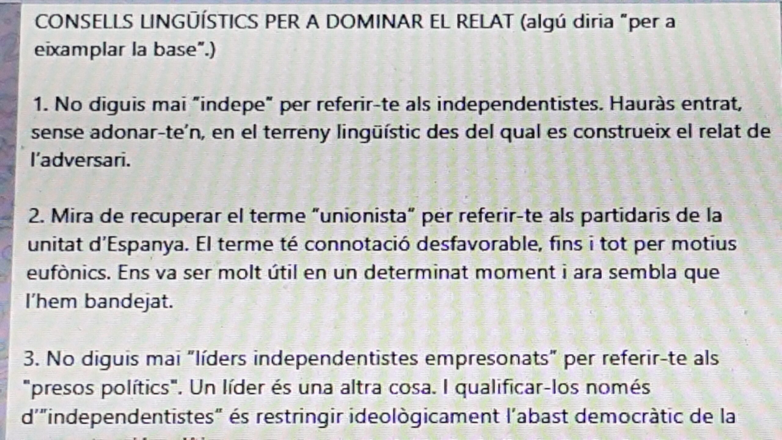 “Quan algú et parli d’«equidistància» o de «neutralitat», mira de conduir la conversa cap a un terreny en el qual hagi d’acabar escollint entre una porra i una urna”, instrueix