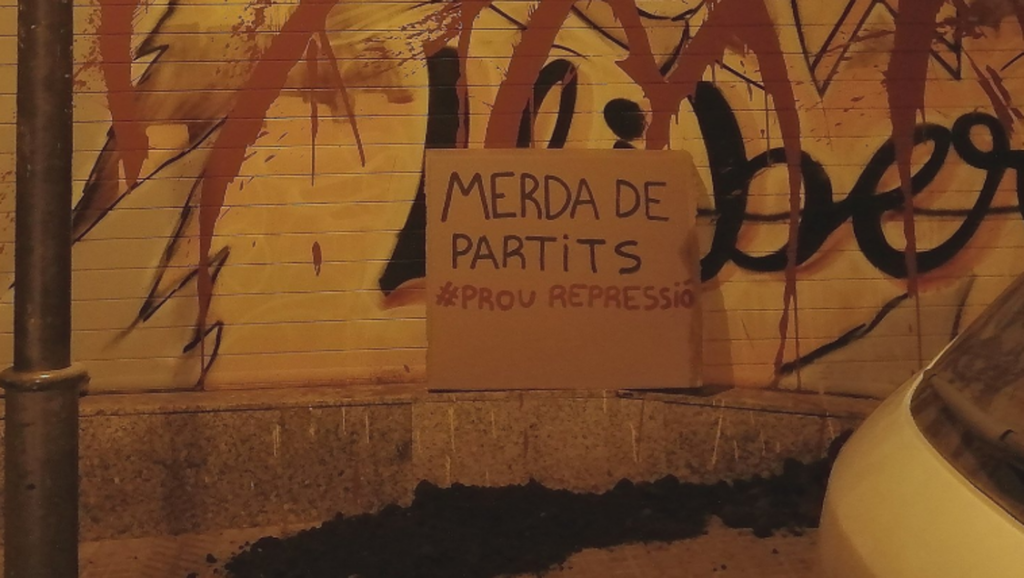 Els CDRs han deixat aquest diumenge a la nit excrements a les portes de diverses seus d'Esquerra Republicana i del PDECat. Ho han anunciat els mateixos Comitès de Defensa de la República a Twitter. Han actuat sota el lema "Merda de partits" a Terrassa, Tarragona, Igualada, Balaguer, Tàrrega, Vic, Lleida i Vilafranca.