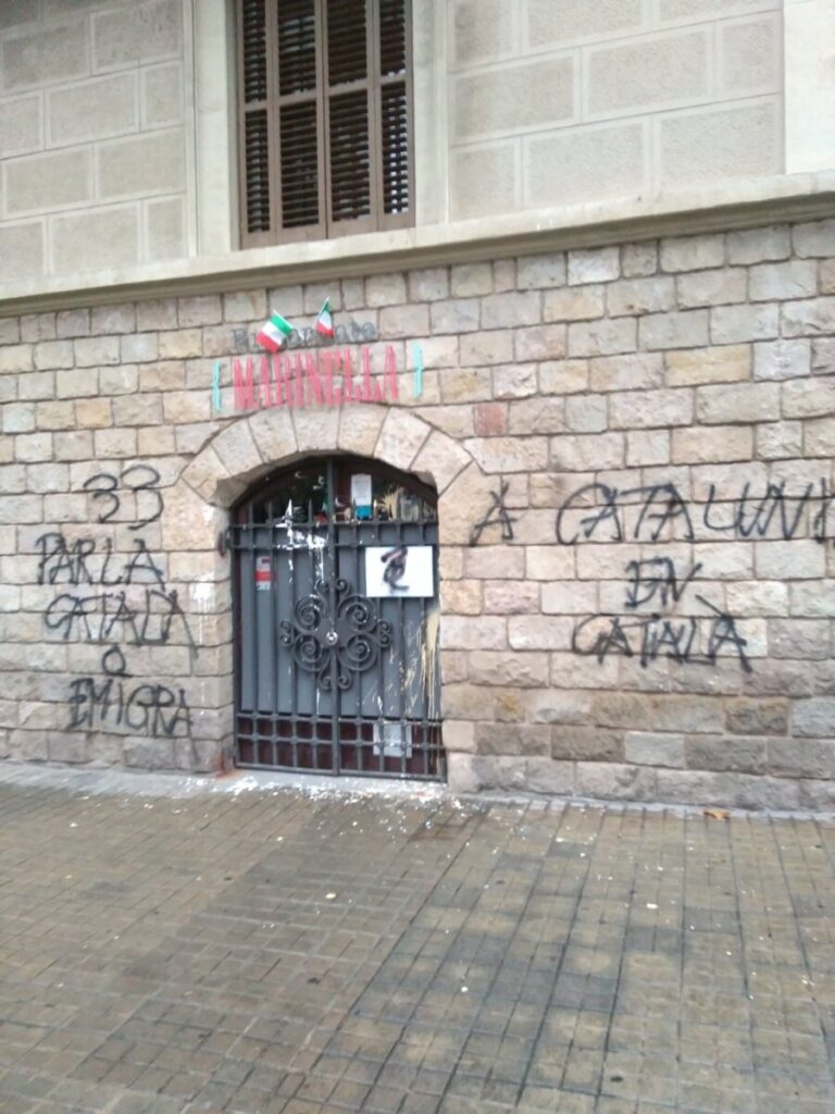 El restaurant italià Marinella, situat al districte de Sant Martí de Barcelona, s’ha trobat aquest divendres al matí, pintades a les parets exteriors del local, expressions pròpies de sectors ultra de l’independentisme: “33” (símbol de l’ultranacionalisme català que vol dir “Catalunya catalana”), “Parla català o emigra” i “A Catalunya, en català”.