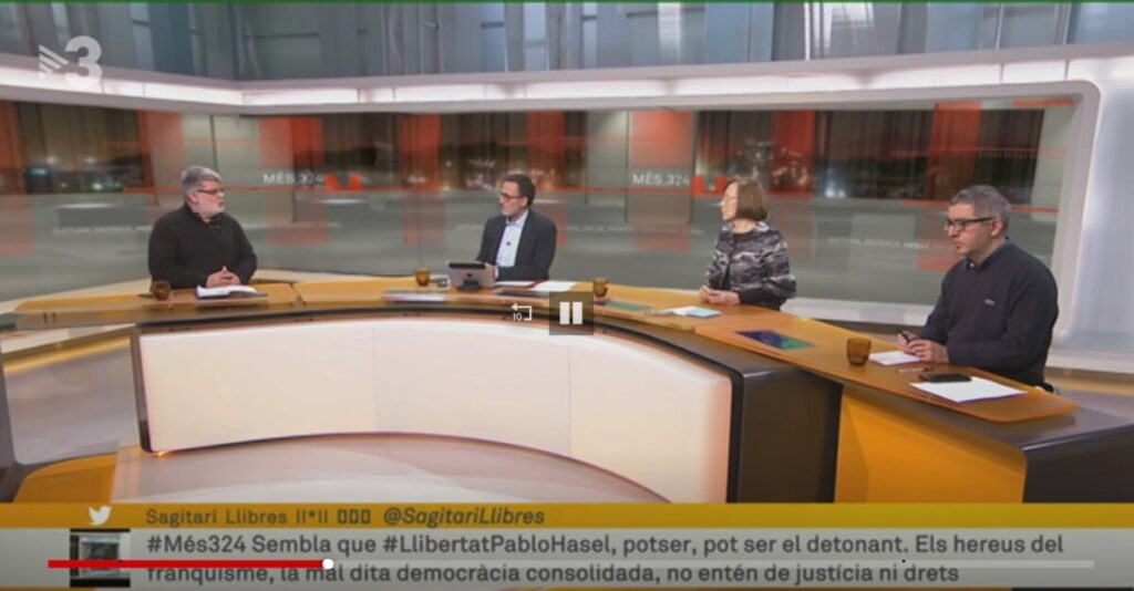 Xavier Graset ha recuperat la publicació dels missatges que envien els espectadors al canal de Twitter del programa Més 324, després d’haver-los suspès durant la campanya electoral. Aquest dimecres 17 de febrer, en va passar 128, la immensa majoria dels quals van justificar els actes violents que es van produir a diverses ciutats per protestar contra l’empresonament del raper Pablo Hasél. Només 5 missatges van criticar els manifestants i Hasél o van sortir en defensa de l’actuació dels mossos d’esquadra. El propi Graset va introduir el programa parlant d’una “jornada de protestes i indignació arreu del país”, referint-se al lideratge d’Espanya “en la galdosa classificació dels països amb més artistes represaliats i condemnats” i afirmant que Hasél ha estat empresonat “per les lletres de les seves cançons”. Un dels tertulians, el periodista Eduard Voltas, -els altres dos van ser l’ex-consellera d’Interior, Montse Tura, i l’escriptor Jordi Amat-, va començar la seva intervenció dient que “no cauré en la trampa de preocupar-me dels contenidors cremats”.