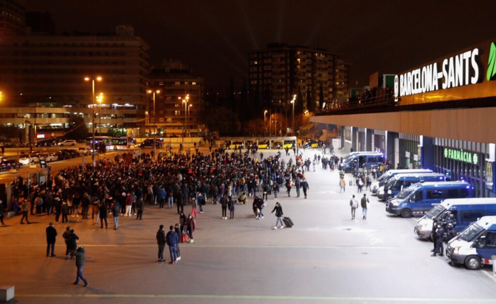Unes 300 persones s’han concentrat davant de l’estació de Sants de Barcelona, completament blindada pels Mossos d’Esquadra. Abans de començar la manifestació s’ha fet una petita assemblea entre els participants en què han posat en comú què els ha portat a manifestar-se. Alguns han dit que no era només la defensa de Pablo Hasél, sinó que també volen protestar per la llei mordassa, pels desnonaments, per la precarietat laboral que viuen molts joves i contra la reforma laboral.
