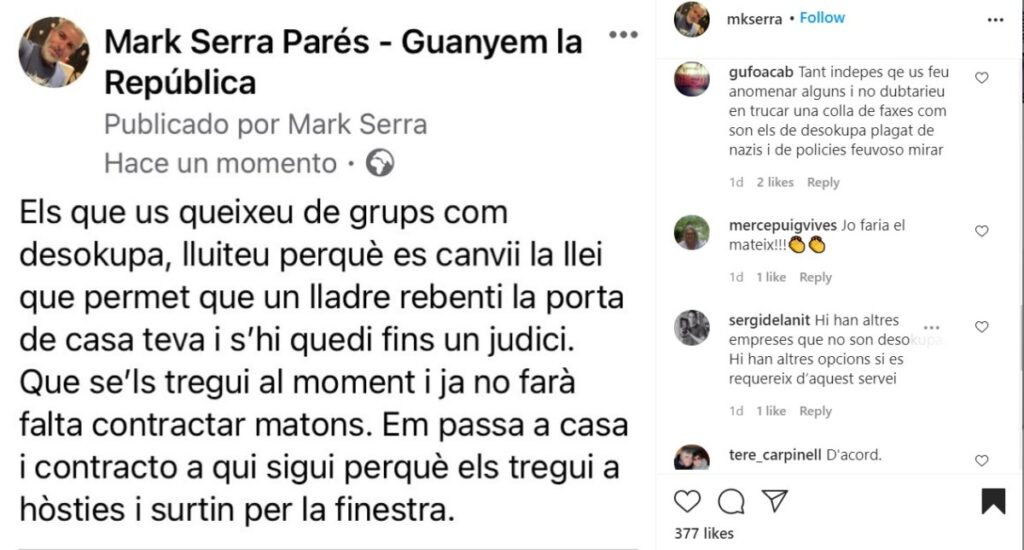 Mark Serra. Fa uns dies va penjar al seu perfil d’Instagram el missatge següent: “Els que us queixeu de grups com Desokupa, lluiteu perquè es canviï la llei que permet que un lladre rebenti la porta de casa teva i s’hi quedi fins el judici. Que se’ls tregui al moment i ja no farà falta contractar matons. Em passa a casa i contracto a qui sigui perquè els tregui a hòsties i surtin per la finestra”. Aquest post té prop de 400 comentaris, el primer dels quals, d’Isabel Motos, recomana “mai trucar els mossos”. Gerard Aribau també li dona la raó: “Jo tinc el seu contacte i no dubtaré en trucar-los si algú em roba la casa o el pis”.