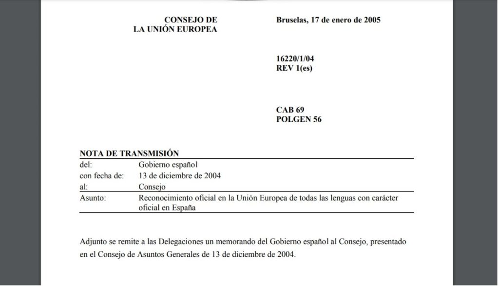 En base a aquesta realitat, el govern espanyol considerava que “la Unió Europea no pot romandre aliena a aquesta realitat. En aquesta nova etapa de la construcció europea, que simbolitza el Tractat pel qual s’estableix una Constitució per a Europa, cal apropar Europa i les seves institucions als ciutadans: els homes i dones d’Europa s’han de sentir part del procés d’integració”. I la proposta concreta que feia era que “partint d’aquestes consideracions, el Govern espanyol sol·licita el reconeixement oficial a la Unió Europea de les llengües espanyoles diferents del castellà que compten amb estatut oficial a Espanya”.