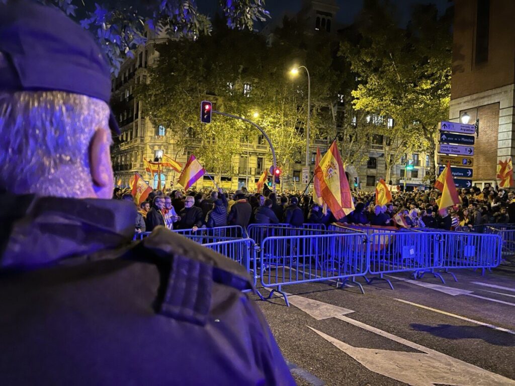 Un miler de persones es concentra per sisena jornada consecutiva a les immediacions del carrer Ferraz de Madrid convocats per Vox i grups d’ultradreta coincidint amb la signatura del pacte entre el PSOE i Junts per la llei d’amnistia i la investidura. La seu està blindada per un fort dispositiu policial de mes de 150 antiavalots que -a diferència de fa 48 hores- de moment no han hagut d’actuar.