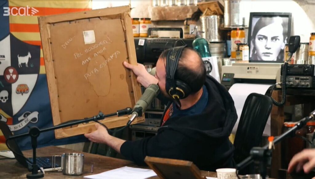 Domínguez va assegurar que els feia molta il·lusió el regal i va dir de penjar-lo sobre el logo de Catalunya Ràdio. El tal Joan de La Seu d’Urgell va dir que si no els deixaven penjar el quadre perquè s’hi veia la cara de Pujol podien fer-ho de manera que es veiés la part del darrere. “És reversible”, va dir. Peyu va penjar el quadre amb la fotografia de l’ex-president de la Generalitat dient que quedava fantàstic per l’enquadrament del vídeo del programa i, referint-se al director de Catalunya Ràdio, va preveure “en Jordi Borda ja s’espavilarà al Parlament a contestar les preguntes”.