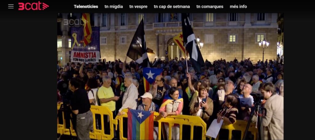 La redactora que va intervenir des de la plaça de Sant Jaume, Rosa Taboada, no oferir aquesta dada ni tampoc ho va fer el presentador del TN vespre, Toni Cruanyes. Tres-cents assistents és, evidentment, símptoma del fracàs de la convocatòria. Taboada va explicar, això sí, que la projecció d’una imatge del president Salvador Illa a l’edifici del Palau de la Generalitat “va despertar la xiulada més gran a la concentració”. La peça informativa sobre l’aniversari del referèndum es va cloure dient que “el que ha celebrat el govern del president Illa és el Dia Internacional de la Gent Gran” amb unes imatges de l’acte que es va celebrar amb aquest motiu.