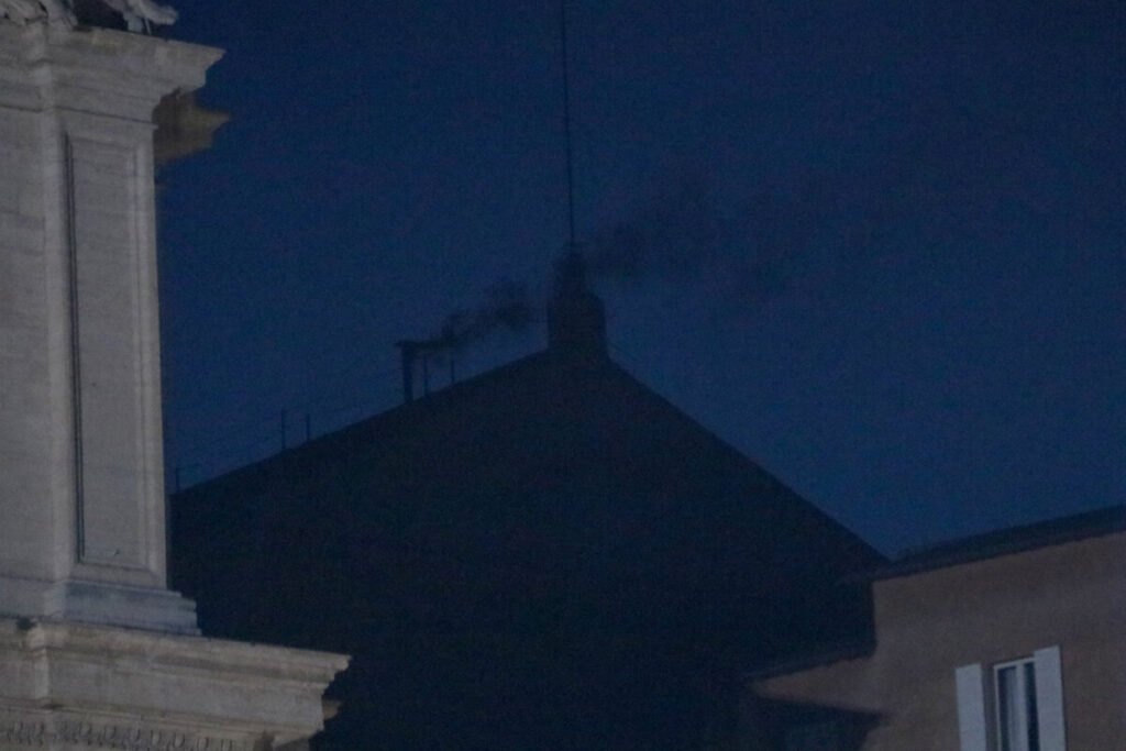 L’esperada fumera ha sortit poc després de les nou de la nit de la xemeneia instal·lada a la basílica de Sant Pere amb un color fosc que ha anunciat al món que no s’ha trobat encara al successor del papa Francesc.