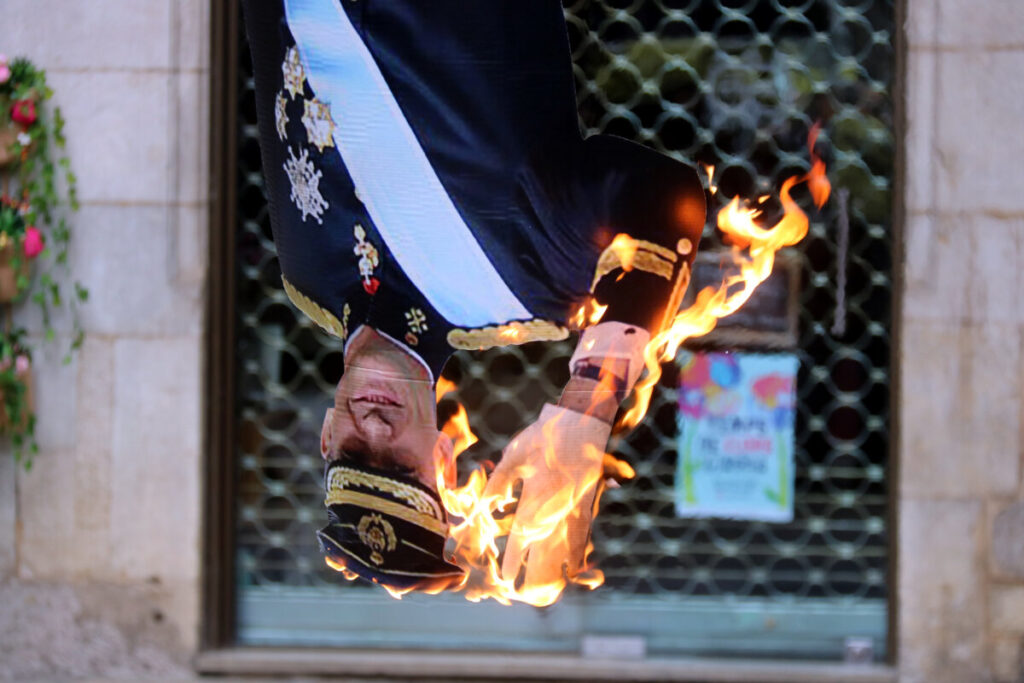 Membres de la Taula per la Independència i la Plataforma Antimonàrquica de Girona han cremat un ninot de cartó de Felip VI cap per avall per reclamar a l’Ajuntament que no pengi la foto del monarca a la sala de plens.