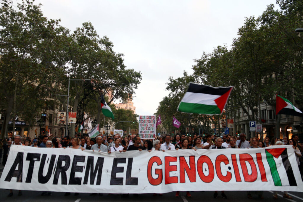 Una manifestació pro Palestina ha recorregut aquest dijous a la tarda el passeig de Gràcia de Barcelona tot exigit que s’aturi el “genocidi”. Els manifestants han arrencat la mobilització passades les set de la tarda des de plaça Catalunya cridant consignes com ara ‘No és una guerra, és un genocidi’.