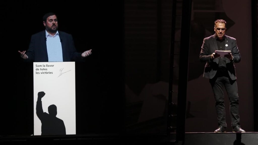 El exvicepresident del Gobierno catalán Oriol Junqueras, en prisión preventiva en la prisión de Lledoners, ha 'reaparecido' este martes en un acto de ERC. El acto ha consistido en una conferencia suya escrita de propia mano y 'pronunciada' sobre el escenario del Sant Jordi Club, en Barcelona, por un holograma del líder republicano.
