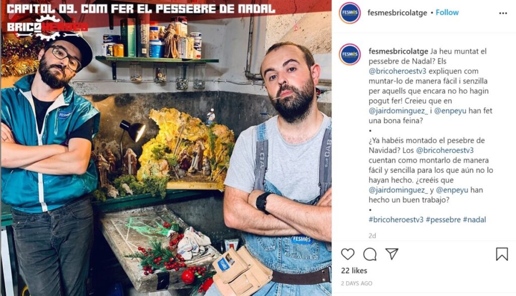 En Instagram, FESMÉS acompaña las imágenes de Jair Domínguez y Peyu luciendo el emblema de la empresa con textos duplicados en catalán y castellano. Contrasta este uso del castellano con el comportamiento de Domínguez durante el programa. En el del pasado domingo 20 de diciembre, dedicado a la construcción de un pesebre, volvió a gritar «puta España» sin venir a cuento en un momento del mismo. Entre risas de ambos, Peyu se lo recriminó. «No mezclemos la política con la Navidad. No tiene nada que ver», dijo. Es la segunda vez que Domínguez grita «puta España» en el transcurso de Bricoheroes. Ya lo hizo el día 1 de noviembre y, a pesar de las quejas de diputados de la oposición en el Parlament, el director de TV3, Vicent Sanchis, no se ha manifestado públicamente sobre aquel insulto. Sanchis dijo en la Comisión de Control de la CCMA que había hablado con algunos colaboradores que incumplen el libro de estilo de la Corporación con gritos como los de Domínguez pero, si ha hablado con él, no le ha hecho demasiado caso.
