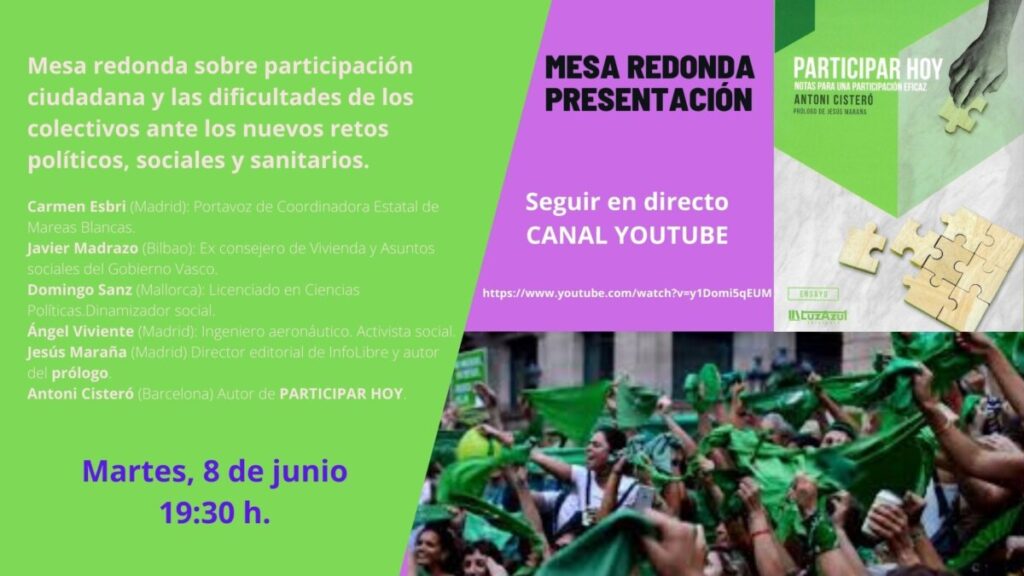 La salida del libro (en ebook y papel) se celebrará, con una mesa redonda sobre el fenómeno de la participación, que contará con la presencia de destacados activistas y dinamizadores culturales, según se puede apreciar en el cartel adjunto. Se podrá seguir en directo en el canal YouTube: https://www.youtube.com/watch?v=y1Domi5qEUM