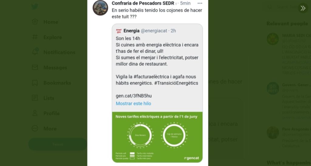 El texto fue recibido con todo tipo de quejas e insultos. «Ejemplo de cómo pretender ser útil a la población sin darse cuenta de que caen en el ridículo y muestran su impotencia», escribió un usuario de la red. «Lo que me faltaba es que una cuenta de Twitter del Govern se burle de la gente y del encarecimiento de las tarifas eléctricas, enviándonos a comer en el restaurante, porque es más económico. Patético», dijo otro. «El paternalismo del Govern ya ha quedado evidente en la gestión de la pandemia, ¡nefasto! Ya salimos adelante bastante bien sin las gracietas y controles desmesurados de quien no tiene sentido común», se lamentaba un tercero. Más contundente fue el que se preguntó «¿De verdad habéis tenido los cojones de hacer este tuit?».