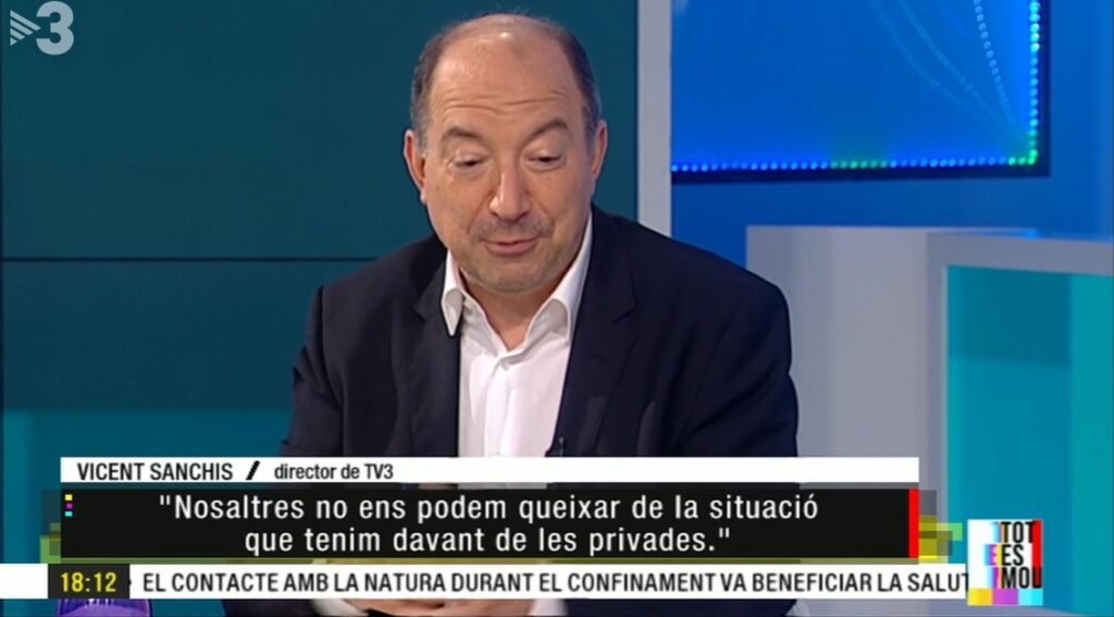 En su desesperación, Sanchis ha hecho todos los esfuerzos y maniobras para arañar audiencia. Compró los derechos audiovisuales de transmisión de los partidos de fútbol de la Copa América, para ver si la gente estaría despierta a las dos de la madrugada para ver los partidos de la Argentina de Messi contra Bolivia o Perú. Repescó un programa de Quim Masferrer y emitió el espectáculo final de El Tricicle. No le ha servido de nada. En uno de sus frecuentes desfiles por los programas de TV3, el pasado día 17, fue al Tot es mou, y la presentadora Helena García Melero le felicitó por la racha de liderazgo de audiencia. Sanchis dijo que haría «trilerismo» para mantenerlo en junio, pero que el mes estaba «muy jodido». Culpó a la transmisión de los partidos de fútbol de la Eurocopa del fracaso de audiencia que se veía venir. «Si la selección española se clasifica sufriremos como verracos», añadió. La selección española se ha clasificado. Sanchis ha sufrido y la racha de liderazgo de TV3 se ha roto y no sólo por el fútbol.