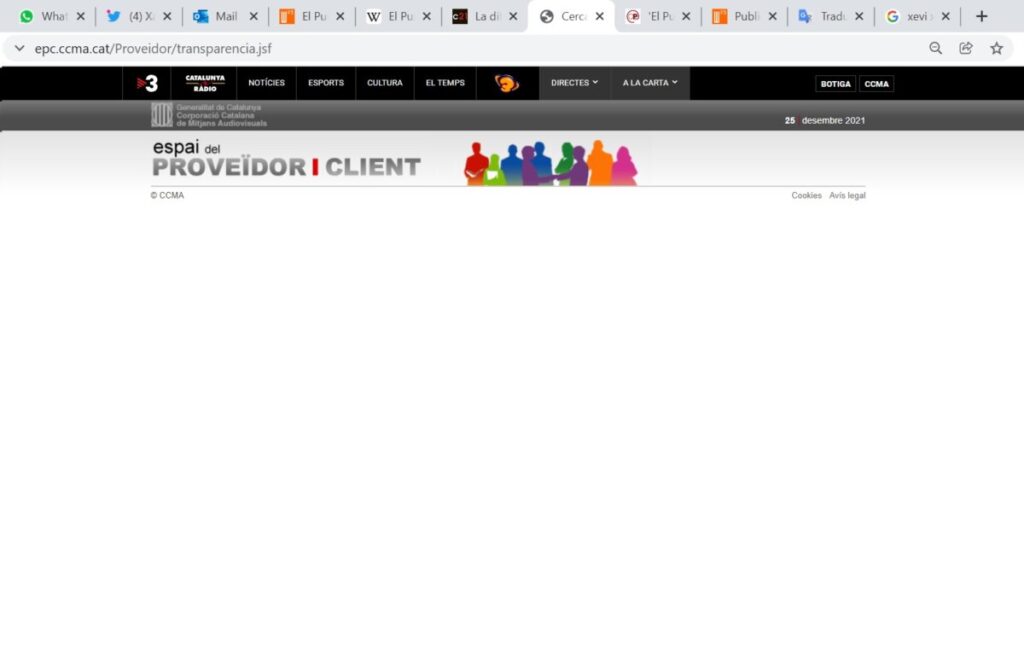 La de la Corporación Catalana de Medios Audiovisuales (CCMA). No funciona desde hace una semana. El Espacio del Proveedor/Cliente de la CCMA, que permite saber qué contratos han firmado TV3 y Catalunya Ràdio y cuánto dinero pagan a los que se benefician de ellos ha dejado de estar operativo coincidiendo con el inicio de los días festivos de Navidad.