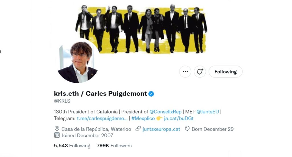 En esta campaña ha contado con la complicidad del actual vicepresidente y consejero de Políticas Digitales y Territorio, Jordi Puigneró, y del activista digital y desarrollador de bases de datos Blockchain, Jordi Baylina. Baylina reside en Suiza desde hace años y se presenta en su perfil de Twitter como “hacker de guante blanco y luchador por la libertad de Catalunya”. Puigneró puso en marcha a finales de 2020, con la colaboración del Cámara de Comercio de Barcelona, el Centre Blockchain de Catalunya. Este centro está domiciliado en Girona y entre las entidades que forman parte de él está la Fundació Nord, liderada por Joan Matamala, persona de confianza de Puigdemont, y presidida por Baylina. Este activista digital, que se presenta en Twitter como jbayina.eth, reconoció en declaraciones a TV3 que se ha reunido en varias ocasiones con el expresidente de la Generalitat en Bélgica, y le ha convencido de que use la etiqueta krls.eth en Twitter. Eth es el acrónimo de la criptomoneda Ethereum.