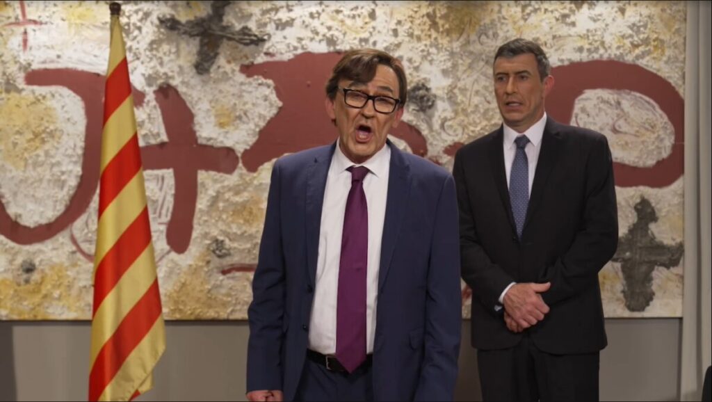 En gags posteriores presentaron a Salvador Illa aprendiendo el himno de Els Segadors, afirmando que el PSC es partidario de la distribución de la riqueza y que por eso defiende el Hard Rock, ya que distribuirá la riqueza de los pobres hacia los ricos y que el PSC arrasó «de Villanueva a Llorito de Mar» (ironizando con una traducción al castellano sin sentido de las poblaciones de Vilanova yLloret de Mar). En este último gag, que representaba la muerte del ‘procés’, Carles Puigdemont, que momentos antes había dicho que «la dignidad no se hace sola» aseguró que «también es mala suerte. Ahora que iba a levantar la DUI. Lo digo en serio, ¡eh!”. Ninguna broma relacionada con la trama rusa del ‘procés’ en la que está implicado Puigdemont, la fallida operación con la candidata número 2 de su lista o el apoyo a Israel de Junts pese al genocidio que está cometiendo en Palestina,
