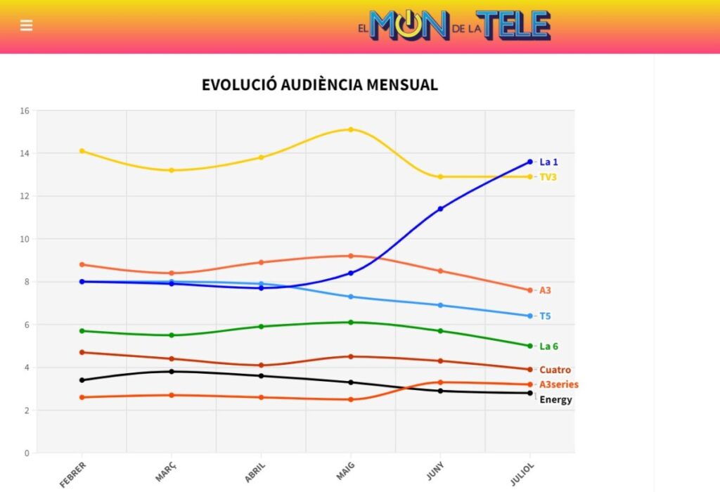 Al comenzar cada mes, la Corporación Catalana de Medios Audiovisuales (CCMA) ha difundido puntualmente durante los pasados 35 que TV3 había sido líder de la audiencia televisiva en el que se acababa de cerrar. Sin embargo, este mes de agosto no habrá nota triunfal de la CCMA en relación a la audiencia del de julio. Por primera vez desde que se nombró el nuevo consejo de gobierno de la CCMA, en marzo de 2022, TV3 no ha encabezado la audiencia mensual. El 31 de julio, La 1 cuadró el mes con una audiencia del 13,6% mientras que TV3 tuvo que contentarse con un 12,9%.