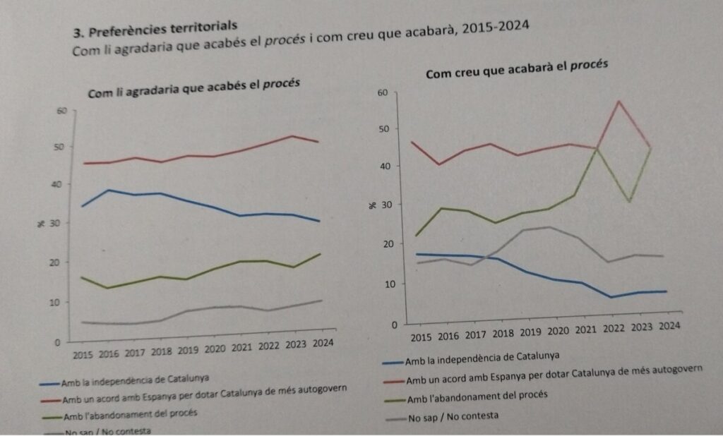 Muchos. Quien ha perdido más es ERC . En 2018 un 83,6% de los catalanes y catalanas que votaron a ERC querían que Cataluña fuera un país independiente. En 2024, este porcentaje cayó hasta el 63,7%. Es decir, casi 20 puntos menos. Muchos votantes de Junts y la CUP también han dejado de creer en la independencia pero son menos que los de ERC. Los independentistas de Junts han pasado del 90,6% al 85,9% y los de la CUP, del 92,6% al 86,2%. Estos datos se incluyen en el Sondeo de Opinión 2024 realizado por el Instituto de Ciencias Políticas y Sociales (ICPS).