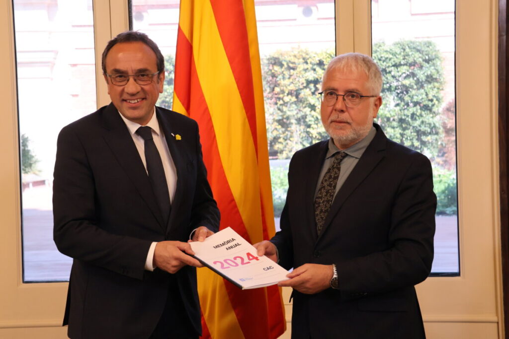 El presidente del Consejo del Audiovisual de Cataluña, Xevi Xirgu, ha entregado el informe del CAC de 2024 al presidente del Parlament, Josep Rull. El documento recoge los 118 acuerdos tomados e incluye, también, una explicación sobre las actividades en relación a la educación en comunicación audiovisual, así como sobre las relaciones con los, usuarios de los servicios audiovisuales, principlamiento sobre las quejas recibidas.