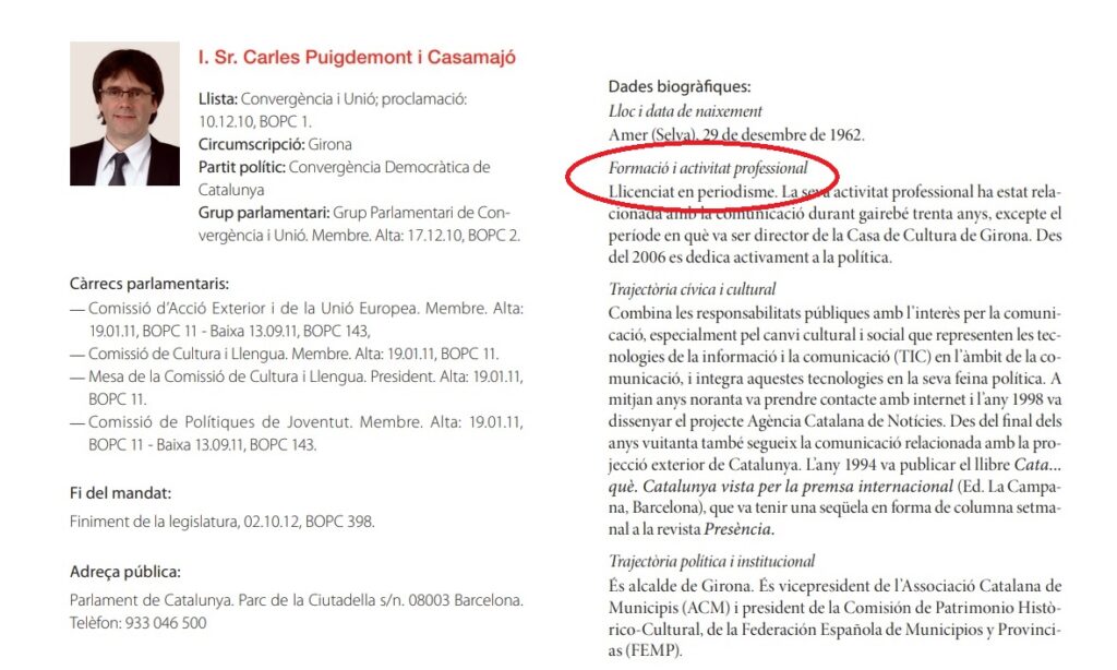 En la ficha que presentó como diputado de la décima legislatura del Parlament el 30 de diciembre de 2012. En aquella ficha borró no sólo la mentira de que era «licenciado en Periodismo» sino que eliminó todo el apartado «Formación y actividad profesional». En la ficha de la novena legislatura hizo constar, con fecha del 10 de diciembre de 2010, que era «licenciado en periodismo» y añadía que «su actividad profesional ha estado relacionada con la comunicación durante casi treinta años, excepto el periodo en que fue director de la Casa de Cultura de Girona. Desde 2006 se dedica activamente a la política». En aquel momento, era alcalde de Girona.