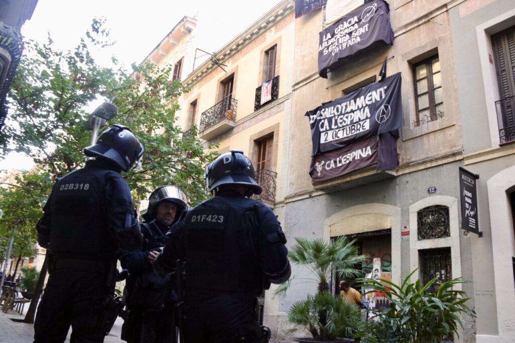 Los Mossos d’Esquadra han iniciado este jueves el desalojo de la casa okupada Ca l’espina, en el barrio de Gràcia de Barcelona, y han sacado a cuatro personas del interior de la finca y descolgado de la fachada a una joven atada con un arnés. Tras retirar todo el material que los okupas habían puesto en puertas y ventanas para blindar el edificio, la policía ha accedido a la finca y la unidad de montaña ha ayudado a bajar a la joven que hacía horas que estaba colgada.