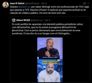 En la red X, Albert RCDE difundió la intervención de Fité y comentó que «es muy peligroso hacer aparecer en la televisión pública a periodistas ultras como Carles Fité (…) Como perico pediría que reconsideraran su presencia. Su lugar es un lodazal como el Chiringuito…». Vallvé le dio la razón en otro mensaje en X: «Gracias Albert por saber distinguir entre los profesionales de TV3 y alguien que aparece en TV3. Deberían haberle explicado que esta actitud no tiene cabida en los medios públicos. Lo tenemos que tener todos claro».